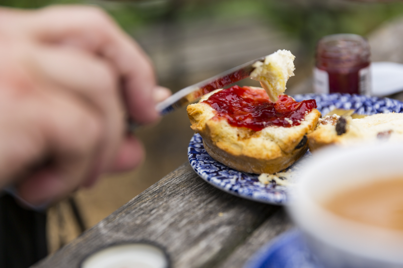 A cream tea consists of a scone, jam, cream, butter and hot drinks.